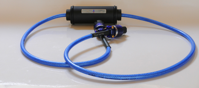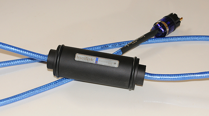 In our current domestic situation—in yet another peaceful rural area, not downtown Rotterdam—there is not merely radio on the mains. There is also DC as our still resident Avantgarde woofers reminded us with some buzz. This was an ideal scenario to test the Syncro in. When the package arrived we found ourselves with a good-quality box that felt surprisingly heavy. Once opened there was a 204cm long blue power cable inside terminated with a Schuko connector on one end and a female IEC on the other. Both connectors were a beautiful translucent purple plastic with gold-plated screws and pins. At 77cm from the Schuko connector sat a 20cm long black canister 7cm in diameter. Clearly this was the cause of the overall weight. Finished with two rubber rings on either side to prevent scratching, the canister sported an IsoTek logo and blue LED. Through the blue sheath the underlying mesh shielding of the blue cable twinkled at the beholder. Overall finish was good.