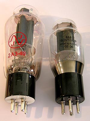| present day single-plate 2A3s are merely 300Bs with their filaments folded in half - 5V/1.2A for a 300B, 2.5V/2.5A for a 2A3. The 300B has basically twice the voltage and half the current of a 2A3." Or as JJ puts it, "The JJ Electronic triode 2A3-40, introduced at the 2003 Las Vegas CES show, has, in contrast to the 300B triode, a heater voltage of only 2.5V. This, when combined with a heater center tap, results in a smaller potential difference with respect to the bias voltage and larger active cathode surface. The result is better sound quality." |