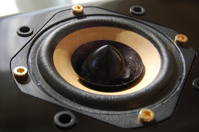 | Examining the 3" paper cone at close range, one can easily spot the disproportionately large surround, a more than subtle hint that the driver is equipped for excursions beyond what is normally expected of a 3" cone. The surround is interwoven fabric for better textural uniformity with the paper cone than rubber or foam. Tommy claims 30-year life expectancy. The other notable feature is the combination of bullet dust cap and whizzer | |||||||||||||||
