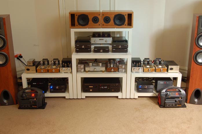 The only downside, from an audiophile point of view, is that the Xantrex is not designed for audio application. It has a built-in 120V AC inverter circuit and jumper cables attached, and apparently no RFI/EMI filtering or noise suppressing device of any sort. Not to mention that it is big, ugly and a totally misfit on the audio rack. The SLA battery is not user-replaceable but for that price, who'd complain? What we really care about is whether there would be any audible difference. Could the Xantrex be the sonic jump starter for the budget-minded value seeker? At first, my feeling was hey, a battery is a battery. Generally speaking, what you expect from an battery-powered amp is there. At times, I almost had to say that the Xantrex was just as 'powerful' as the SLAP until the real sudden burst of energy in Orff's Catulli Carmina set them apart. The SLAP had the upper hand of lightning speed to project an instinctive resilience to bounce back climax after climax. It made the amp sound almost like a muscle amp with super-high damping factor. The Xantrex was not as rock solid and sounded slightly disoriented during the transient burst. I emailed Xantrex with lots of questions but didn't get any response. Understandably, they don't have an obligation to address weird queries outside their field of expertise. The only possible explanation I could find in their User's Guide was that the DC power outlet could sustain a maximum continuous load of "12A with automatic reset (of the circuit breaker)". I supposed that means the Xantrex could go over the nominal 3 A but not beyond 12 A. Aside from capability (or the lack of it) to handle high current demand, the Xantrex seemed to be lacking the harmonic richness and textural suaveness of the SLAP. This was particularly noticeable on instruments like harp and the piano (Mozart's Sonatas) where a translucent, pearly touch would have added so much; and perhaps to a lesser extent, the flute, clarinet and coloratura soprano (Bellini, Rossini and of course that demanding aria "The Vengeance of Hell" from the Queen of the Night by Mozart). Bass was reasonably well defined but definitely not as deep. Then I compared the Xantrex with the PSU to cross-check. One thing it surely did well (and almost comparable to SLAP) was opening up the soundstage with localization of musical instruments and three-dimensional layering. |