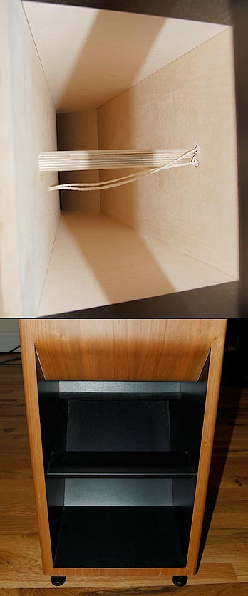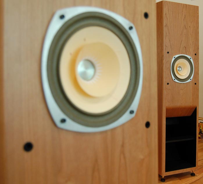 The 1.8 cabinets are 50" high, 12.5" wide and 16.5" deep at the base, tapering to 13 ¾" at the top. Seen from the side, the front face of the Lamhorns has a gentle rearward slope toward the top. This seats the driver at a slight tilt or rake 30" above the floor when standing up on the supplied spikes and measured from the driver's center. I added a pair of Yamamoto ebony footers under the spikes to protect my wood floors. This made positioning adjustments a breeze. At 145lbs apiece, the Lamhorns on stilettos would love to couple with unprotected floors. The binding posts are Cardas Silvers and I actually left off the screw-down pieces since my banana'd cables don't need 'em. The entire cabinet is made from 1"/17-layer Brazilian Birch plywood. The review pair was finished in a natural Cheery veneer. Other finishes are available and include Red Oak, Black Oak and Rosewood (a $750 option). Internal wiring is pure silver with a natural cotton sleeve. Two of the internal braces are visible in the horn mouth, and there is a third up the road a ways. These cabinets are extremely rigid and sturdy. They were also obviously man-handled by UPS. Judging by the condition of the screw-in footers, they'd endured a few drop tests. The overall appearance is understated and elegant. I found myself prone to a quick rub or pat on the head each time I walked by (more on this strange behavior later). The Lamhorns are available with a few driver options: the AER MK-I as found in the review pair; the REPs R-1 which brings the price to $16,000 Canadian; and a variety of Lowthers including the EX/DX4 and EX/DX 3. Robert Lamarre has also used a custom Hemp driver (this was used for the Montreal Show in 2005) but the final production Hemp driver is still in development. Since I'd be reviewing one iteration, I asked Robert for comments on some of the other drivers. "As for the differences with drivers, the AER has the least amount of cone coloration. The Reps are second and the Lowthers -- with the new whizzer cone introduced a few years ago -- a close third. Where the AER marks a clear difference is in the 2.5 to 4kHz region. It has no peak at all. The others do. To some, the upper midrange peak in the presence region is fine while others find it objectionable. I must admit my favorite driver is the AER MK1 but in some systems where the amps are a little soft, the Lowthers and Reps can do wonders. I should add that because I use Tenor amps myself which are ruthlessly revealing, the MK1s are the best bet. It really is a question of system matching and taste." |