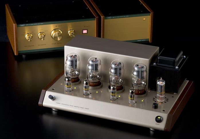 The Leben product line includes three integrated amplifiers (the CS300, the CS300X Limited [below] and the CS600), a two-chassis full-function preamplifier (the RS28C) and two power amplifiers (the CS250 and the CS660P). The $2495 Leben CS300 is a 12-watt integrated amplifier using EL84 tubes. Both the CS300 and the CS300X Limited Edition use a simple push-pull circuit which Hyodo San feels provides the most musical design. This is the entry level Leben integrated amplifier and uses a hand-selected complement of parts that are cost effective yet still provide for a musical sound in the Leben tradition. All of the integrateds share a common styling that is tastefully retro. The integrated amplifier chassis all have attractive wood sides, which is referred to as cabinet style in Japan. |