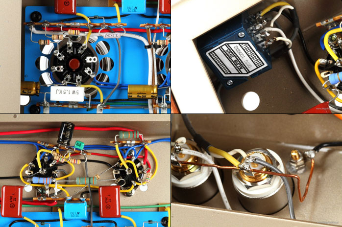 A mechanical power mains switch on the front panel is accompanied by a green LED and a volume knob. Around back we find a pair of high-quality Canary RCA posts (interestingly mounted in recessed XLR fashion) and two pairs of gold-plated speaker posts. A switch between the posts alters output impedance from 4 to 6, 8 and 16Ω. Another switch selects stereo or mono operation, two more chose proper bias/heater setting for your output tubes of choice. Finally there’s the ubiquitous IEC power inlet.
