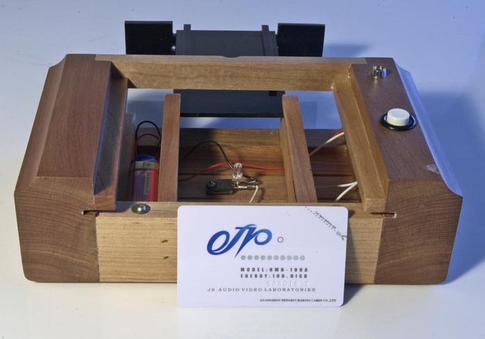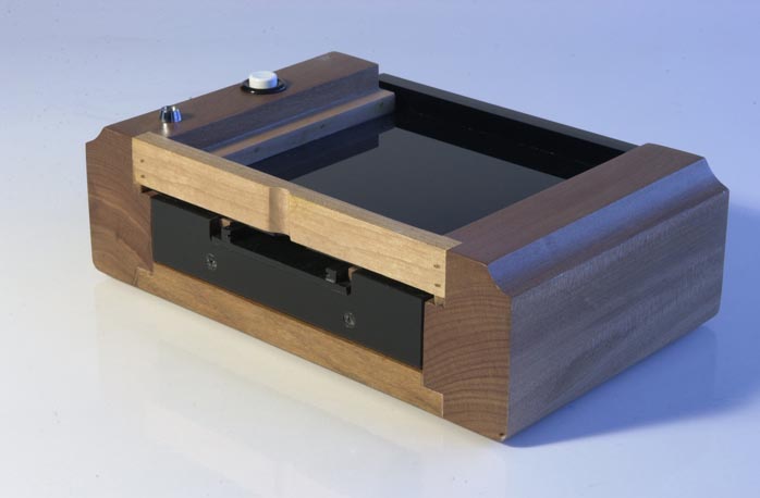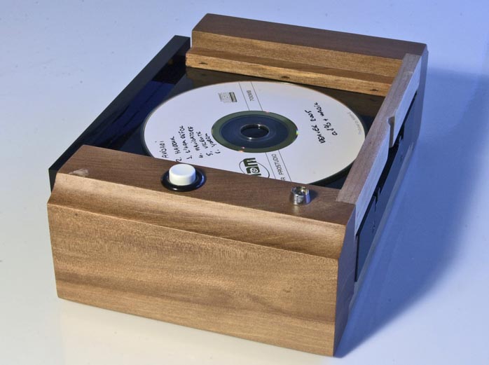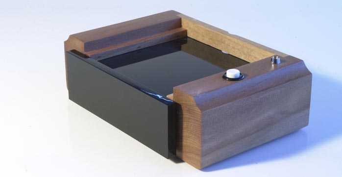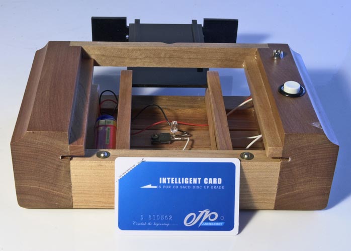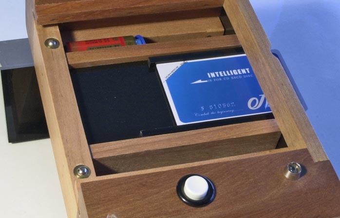 In a reply to our Intelligent Chip rediscovery that was described here, we received an e-mail from MachinaDynamica's Geoff Kait. He offered us the latest installment in the 'Intelligent' series -- the Intelligent Box or IB -- for testing. We gladly accepted since we are still keen on understanding the exact workings of any light treatment on optical discs which in virtually all cases enhances sound quality. The regrettable recent demise of the Nespa's original inventor with whom we had an ongoing dialogue stopped our investigations short before getting his complete answer. So when the package from MachinaDynamica arrived, we had another chance to literally shed some more light on the subject. From the package we retrieved a sculpted wooden box and a smaller package wrapped in tinfoil. The box, assembled from an attractive variety of woods, measures around 2.5 x 15 x 7 cm (9 x 6 x 2.8 inches). Looking at the front of the IB, we see a black acrylic part fitted with a slot screwed to the middle of the fascia. The top of the IB has a white switch and a control light mounted to the left side. Next to these controls is a large recess made of the same black acrylic used for the front and clearly intended to hold the CD to be treated. No further external features are present - or it has to be the louvered bottom. |