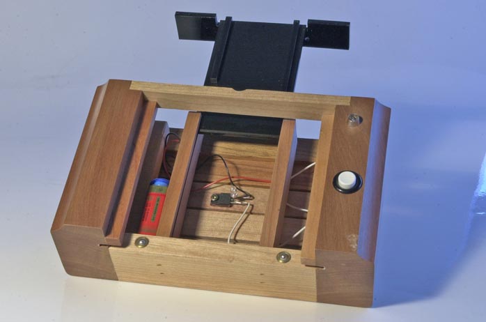 Inside the IB things get a bit more interesting. The top acrylic plate can be slid away easily on two spring-loaded ball bearings to open the box. Here we find the power source in the form of a 9-Volt battery and the top of the slot coming from the fascia. In order to ready the IB for use, we connected the battery to the connector next to it. The wires from the battery connect to the light on one end, then disappear under the slotted plate on the other. The plate holds two rails, the right one shorter than the left. |