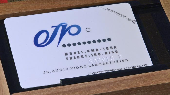 So far no sign of magic or any intelligence in this Intelligent Box. Time for some screwdriver action. Two screws hold the acrylic slot inlay and once removed, the part can easily be retracted from the enclosure. Under this acrylic part sits a laser diode like a lonely space invader. When we hit the button, the laser lit up with a red light. So the innards look simple. However, there is more to the Intelligent Box. From the tin foil wrapper came a sort of credit card. The front stated Intelligent Card, "is for cd sacd upgrade" and holds a serial number. One corner has a cut-off scissor marking. On the back is a row of 10 shiny dots and the manufacturer's name, J.S. Audio Video Laboratories, a name that leads to a large electronics company in Guangzhou, China. Now these dots on the card looked familiar. In the Intelligent Chip, a product now defunct and superseded by the IB, you could find either 1 or 3 of these little shiny metal dots. Each of the dots was 'valid' for 10 treatments and then wore out. This rendered the chips capable for 10 or 30 CD treatments depending on chip potency. With the credit card's 10 dots, this means at least 100 CDs. |
