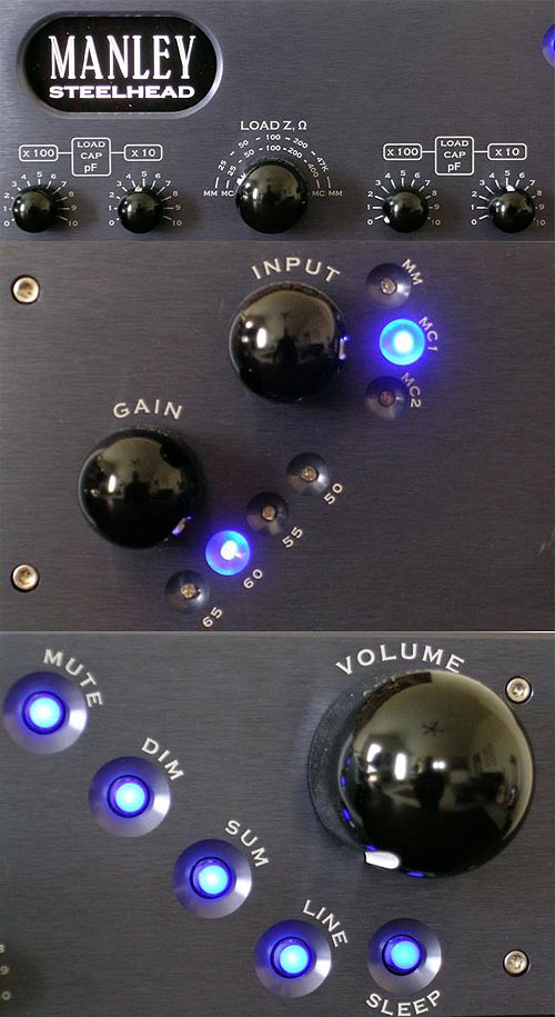 | For moving magnet cartridges, the load switch selects between different fixed resistors in the values of 25-50-100-200 or 47K ohms. The Steelhead manual also says that "MM cartridges capable of properly driving low impedance loads between 25 and 400 ohms should be auditioned through both the MM and MC inputs. By doing so, you may find the most appropriate sonic character through the use of unconventional input arrangements. In short, experiment; don't let the control labeling stop you. On the contrary, we invite you to tweak away." So in short, twirl the knobs until you like the way it sounds. It doesn't get much easier than that! To each side of the load switch are two switches for each channel. They allow you to select cartridge termination capacitance in 10 pF steps up to 1100 pico Farads. The manual explains that "the termination capacitance is present at the gain stage inputs and is not affected by input selector or gain switch changes. For best accuracy consult your phono interconnect cable literature or manufacturer to determine how much of the termination capacitance may be attributed to the cable. Then subtract at least that amount from the target capacitive termination value. "If the interconnect manufacturer does not know the amount of capacitance per unit length that their wire presents (!), then refer to the following example for a starting point: Typical phono interconnect cables will exhibit self-capacitance on the order of about 30 pF per foot. If the interconnect cable is 3 feet (~ 1 meter) in length, you may expect about 90-100 pF of input capacitance present due to the interconnect cable alone. If the cartridge manufacturer specifies a load capacitance of 150 pF, then it is best to subtract the cable's portion, i.e. 90 pF. This yields a balance of 60 pF. Thus, the audition should start with the termination capacitance switches set to 60 pF." Got that? |
