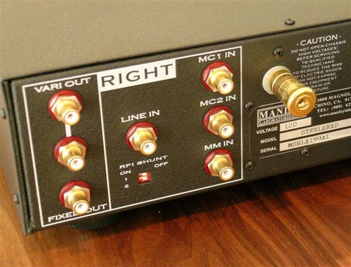 | The idea behind all this adjustability is that each cartridge transmits maximum signal when loaded with a given amount of resistance and capacitance as specified by the manufacturer. When it is dialed in right, "the signal developed by the cartridge is at maximum power transfer into the preamp, with minimum overshoot and ringing, flattest frequency response and gentle roll-off characteristics." The Steelhead's manual recommends you start with the settings specified by the cartridge manufacturer (minus the interconnect capacitance) and then vary it until you like how it sounds. Unless you have it, you need not really know the settings for the cartridge. Just dial it by ear. The manual recommends that 150 pF is a good starting place as the standard "used by preamp manufacturers past and present." The capacitance loading affects different cartridges in different ways depending on their design, but the general sonic attributes that will change are the imaging and spatial cues, the high-frequency content and the forwardness and speed of the sound. As we continue our march across the front panel, we encounter the input and gain selectors. The gain selector allows you to adjust the preamplifiers gain to match differing cartridge output levels and interconnect drive voltage requirements for long interconnect runs. The user can select from 50 to 65dB of gain in 5dB increments. The manual also says that the "MC step-up autoformer may provide approximately 2 to 12dB of additional voltage gain depending on cartridge source impedance and load switch setting." There are three separate phono inputs on the Steelhead so you can run multiple turntables or tonearms into it. There are two MC inputs and one MM input selected with the input selector located above the gain selector. |