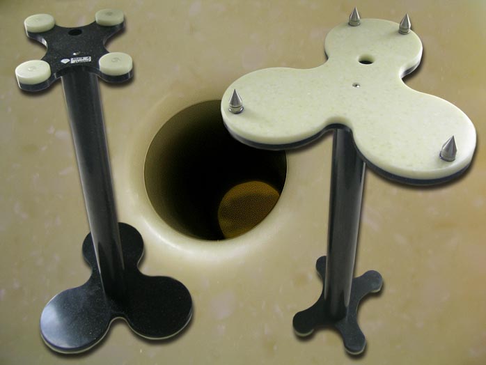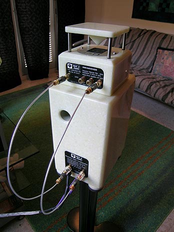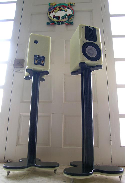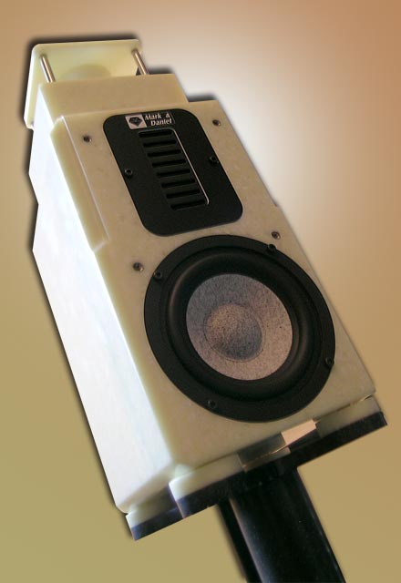 Being less than a foot tall, the usual 24" speaker stands will be too short for Ruby to properly align her drivers with the listener's seated height. So a 28-incher is called for. Mark & Daniel naturally offer one that perfectly matches function and cosmetics. You could easily substitute it with a generic stand of your choice if their $700/pr asking price for the synthetic marble version seemed too steep (beauty does have its price as any woman will tell you). The optional stand here features a hollow dress column for speaker cables. |