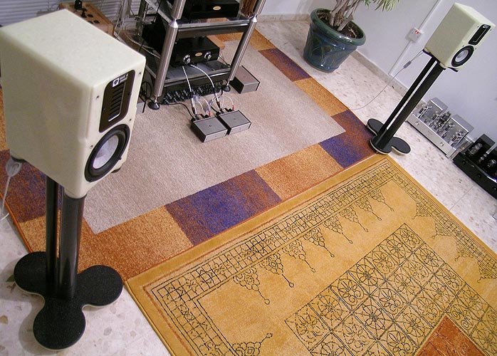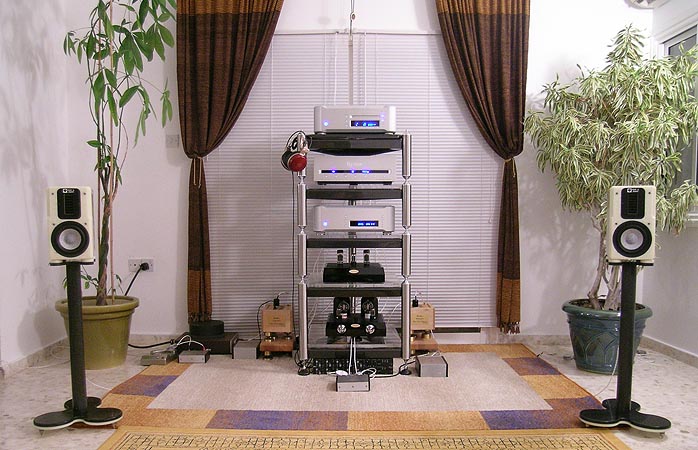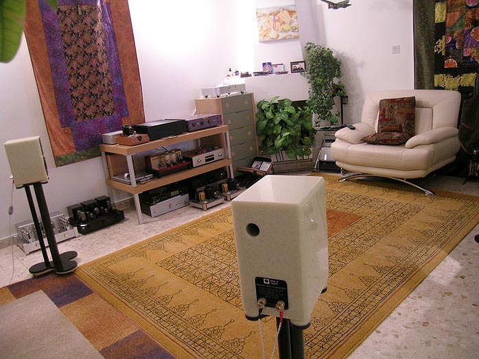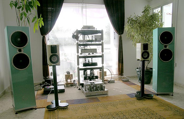 To run them in a bit, I strapped them to the 18-watt Raysonic SE-30A paralleled EL34 SET integrated. Preceding that was the Supratek Cabernet Dual. It would pass a higher-than-normal CD signal to the inputs of the Raysonic which also needed break-in for its forthcoming review. Careful to not overload its first stage, I killed two flies with one swat and netted satisfactory-enough sound pressure levels to somewhat cheat on Ruby's law that only manly amps may apply as suitors. I also presampled my AudioSector Patek SE. Simply run as a 50-watt stereo amp fronted by a 27dB max gain tube preamp with valve regulators (its adjustable gain factor set to third attenuation stage, again to not overload the amp), the puny little box on the floor between the speakers played the Rubies louder than necessary so power was sufficient. |