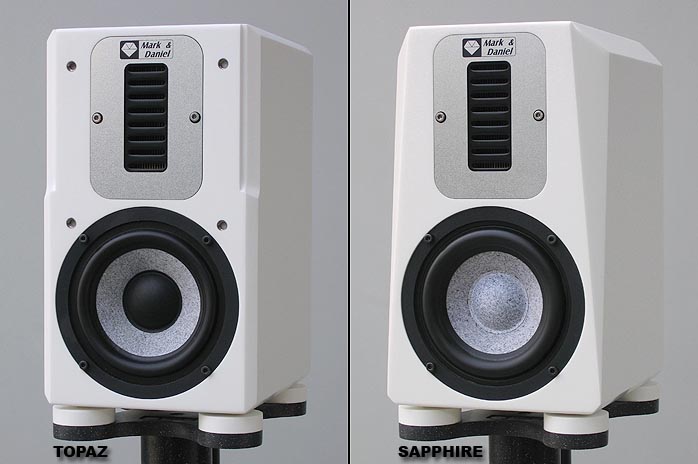 You see, I'm to this day a very happy owner of two Mark & Daniel Maximus models, the Maximus-Monitor and the Maximus-Ruby. Our editor Srajan owns the Ruby and though he doesn't hand out awards easily, granted them a Blue Moon Award. In our combined reviews, you needn't read between the lines to understand that the Mark & Daniel speakers are power hungry. As reported, my 50wpc Audio Zone AMP-ST clipped during orchestral climaxes when driving the Ruby. Both Srajan and I concurred that you need beefy muscle amps to feed the M&D giant killers. And that is exactly why the new models were introduced - giant killers that feed on a lower calorie diet! For starters, the Ruby, Topaz and Sapphire all sport identical dimensions (11.4" H x 6.7" W x 8.4" D) and will sit snugly on their matching CAM stands. However , they are not entirely identical in specs or cosmetics: |
