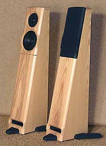 A front-firing transmission line terminus presents a heavily bullnosed 6-inch slot at the base of the solid 3/4", clear-lacquered natural Ash baffle. Above it is the firm's singing bird logo carved directly into the hardwood. The two-way Vifa driver complement consists of an exposed 1" softdome with a glossy sealer, and a polyfiber mid/woofer whose diameter barely exceeds 3.5" from inside-surround to inside-surround. When my wife first spotted the Swifts on the living room floor, she unsolicitdely commented on how great-looking they were. Small and elegant, their sloped baffle projects sounds far higher than their modest profile would ever suggest. |