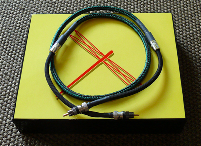 | In use. Input equality. The MA-1 auto-switches itself quietly with incoming sampling frequency changes. This confirms by the position of the signal lock light. To test for input equality, I had CDs spinning inside my Esoteric UX-1 fed to the DAC's first coaxial input via Chris Sommovigo's very best Tombo Trøn S/PDIF cable [right]. This I compared on the fly to a USB feed from my iMac running PureMusic 1.8 in memory play. With perfect sync of CD and iTunes playback, the instantaneous switch from coax to USB via Meitner's remote was utterly undetectable. Switching back from USB to coax inserted a momentary mute as though S/PDIF had to first initialize while USB was always already on. Regardless, there were no audible differences even over the long run! In prior such comparisons USB most often had enjoyed a minor advantage. |