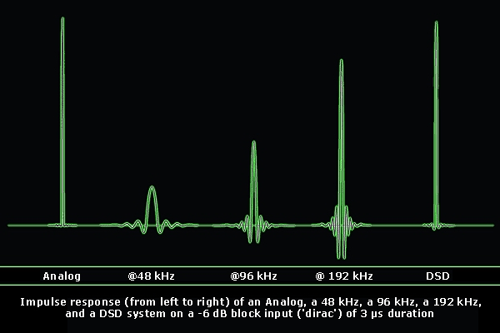 *1 "Every EMMlabs DAC from the beginning has converted PCM to DSD. Ed's is a pure 1-bit system. Ed believes most of the critical problems with digital audio happens at the twin transitions from analog to digital and from digital to analog. Contrary to conventional wisdom Ed is convinced the advantages of pure 1-bit converters far outweigh their disadvantages. An unadulterated 1-bit DAC produces a far more natural more analog transient response [see image above] than multibit methods and no trick DSP filtering is required. From Ed's perspective as a bit of a truth seeker and perfectionist, it isn't that one sounds 'soft' and one doesn't. It is that one is realistic and like nature whereas the other is artificial and unnatural."