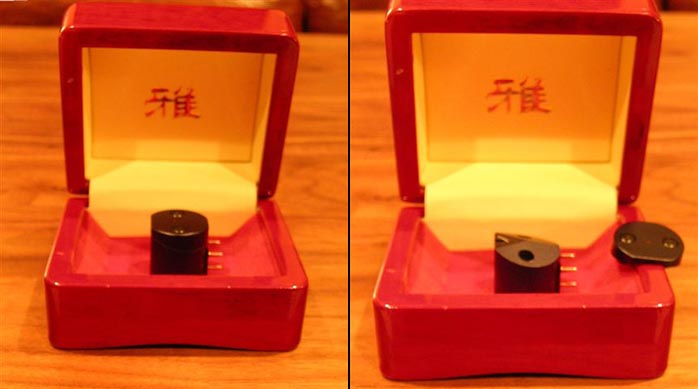 I was pretty much awed by the stylish appearance of the Miyabi Standard moving coil cartridge in its jewelry-like polished wooden case - a fitting container given the amount of artistry that goes into making each and every Miyabi cartridge. The Standard's body is crafted from aluminum and its rounded shape is a styling cue taken from the first cartridge design Mark Levinson ordered for his Cello product line. The Standard also has a very unique stylus guard that puzzled the heck out of me for a few seconds before I figured out how to get it off to gain access to the screws beneath that hold the cartridge securely in its case.