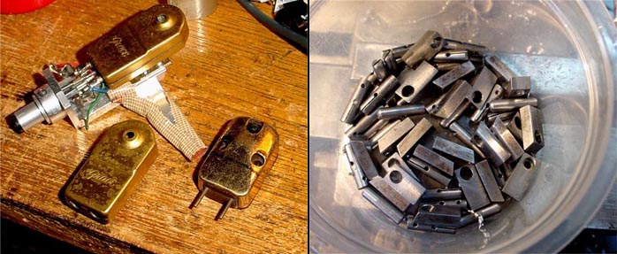 "Another thing that is very important is the composition of the material used at the signal input of cartridges. This material had been used in vintage pro cartridges from Western Electric, Decca, Neumann, EMI etc. (vintage mono cartridges lower left). In the early '60s, this material was replaced by another one which is easier to deal with. Since then, almost all cartridge manufacturers use the new material. That, I think, is the main reason why modern cartridges sounds smooth but rather hifi-ish. The most important midrange is not rich enough. I pretty much understood how to build this style of cartridge 15 years ago. I spent the 30 years before that experimenting. There are manufacturers who seem to recognize what's important. You'll know when you listen to their product. Assembling a cartridge is not a big deal. Everybody can do it after a year of practice. Even designing a cartridge is not a big deal if you just want an average product. It's a damn repetition and I wasted a lot of time in that pattern too.