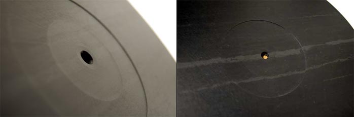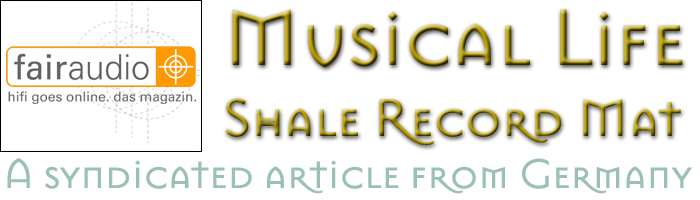 The black disc goes by the name of Shale Damping Mat and is built by Musical Life whose owner Michael Stolz likes to employ slate in strategic places also for his own turntables. Slate's amorphous structure is said to exhibit an excellent balance of self damping and transmissive qualities whereas Herr Stolz finds acrylic less than ideal, being predominantly a damper. The Damping Mat is crafted to order from 6mm thickness up to 8 and 10mm. I wanted the thinnest to see my platter's shaft protrude sufficiently. What's ultimately appropriate depends on your table and shaft height. A few measurements and a brief el consulto with Herr Stolz will have you set. |