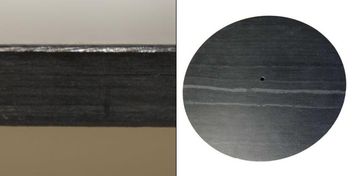 I wasn't planning on this report. I hit upon this subject which won't interest everyone by chance. But since I find the improvements obvious and positive; and since more than a few people are willing to fork over 5-figure amounts for homeopathic band aids of dubious efficacy; a brief alert seemed called for - on a shale disc to be placed atop a turntable. So yes, this encounter was coincidental. Cue up moi. I check whether my Acoustic Solid MPX runs squared off. My small bubble level falls on the bare platter and then off to roll underneath the couch. The resultant sound woulda done a tuning fork proud. Hmph. Ringing isn't exactly what you expect from a record platter. Which explains why the MPX is delivered with a 6mm thick acrylic decoupling disc, atop which I place a leather mat and only then the black gold. How to tell though how many worthwhile materials might be placed atop a metal platter? Enter the Google and the Internets. They led me to the webpage of Frank Landmesser who claimed a slate disc graced his Fat Bob to good effect. This called for a personal experiment... |