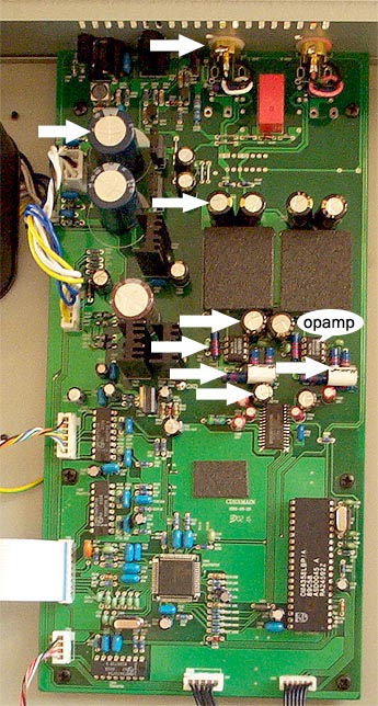 The incentive for today's follow-up exercise will be obvious to any performance-shopping, budget-conscious music lover. How much improvement exists between these three different incarnations of the same player? As the above images show, the stock [left] and Level 1 [right] boards differ in the output jacks, SoundCoat applications and capacitor/resistor upgrades around the main chips and buffer amps in the analog output stage. The + iteration of the Level 1's 627 addition has been made possible by ingenuity. Parts ConneXion head honcho Chris Johnson was looking for a way to upgrade the ubiquitous "dual" op amps that are commonly used in most players. These adaptor pcbs are custom and of his design. They can replace the following chips: AD712, AD827, LF353, LM318, NE5532, NJM2114, NJM4558, NJM4560, NJM5532, OPA2132, OPA2134 and OPA2604. His proprietary BrownNose, er, BrownDog adaptor pcb is an 8-(gold)pin plug-in solution for any of these traditionally socketed op-amps. Should they be hard-soldered to your main pcb, a technician or your own solder-slingin' aptitude will have to unseat them. Those wishing to upgrade their op amps to these current top-drawer buffer amps can obtain them through Walter Liederman's Graham Company for $85/ea. The CD-25 needs two of these adaptors (the right chip is identified by its own speech bubble above), the soon-to-be-reviewed Shanling T-100 uses four. Stock versus Level 1? The stocker sounded thinner, more bare-boned. It seemed bleached, threadbare, lacking in weight and, most importantly, slower as though the tunes were walking through ankle-high water and suffering minor resistance drag. A/Bing between both units on the fly, using identical interconnects and two copies of the same CD, instantly drove home the obvious extent of this performance delta. The increase in tonal fullness and raw drive with the hotrod was akin to notching up the volume control just enough to not be obviously louder, just more fleshed out - exactly what crafty audio salesmen do to subtly rig a demo. Switching back to the stocker was similar to actual veiling, like hanging a thin curtain in front of your speaker. Everything dulled a bit, like an overexposed photograph - washed out detail, softened contrasts, faded color intensities. |