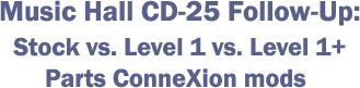 | The Music Hall CD-25 is an affordable, good-sounding and well-built $600 integrated CD player with coaxial and Toslink digital outputs. More than a few reliable after-market modification firms like ASI/Reference Audio Mods and Dan Wright/Response Audio embrace its solid platform to perform their upgrades on. In the latter case, this even includes a tubed output stage, a burgeoning trend apparently started by the popular Heart and Ah Tjoeb players based on gutted Marantz units. Our CD-25 February feature review covered the Parts ConneXion/Graham Company Level 1 mod, performed then on a still Shanling-branded machine since we caught this unit just prior to Roy Hall completing the minor cosmetic silk screen changes and revised color scheme now released as the silver/black (rather than champagne/gray) MMF-CD25.