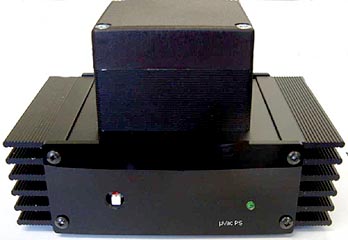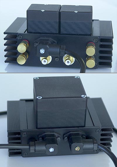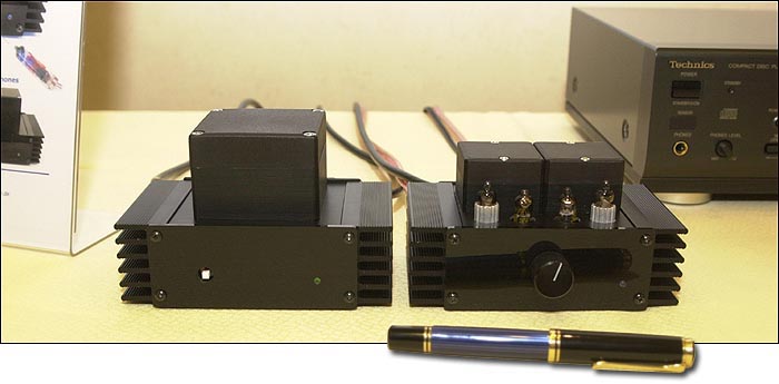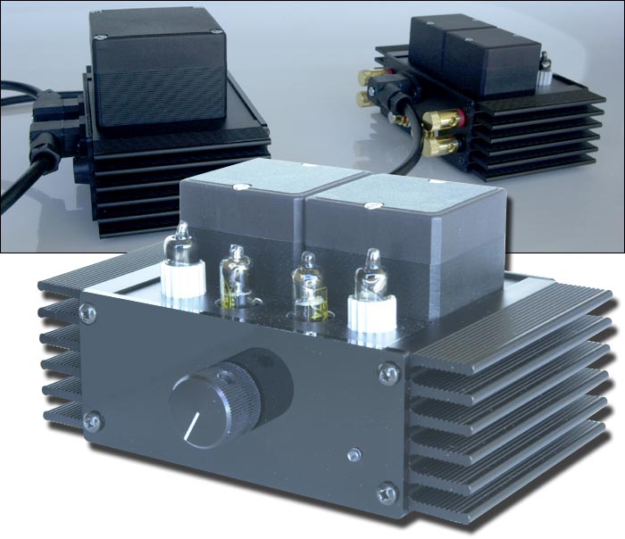| These and similar quotes from E.F. Schumacher's provocative book Small is Beautiful on ecological economics came to mind when we received today's package from Germany. A couple of weeks earlier, we'd visited the Paris audio show and met with Peter Grundig of Greatech, Grundig Radio Experts & Technology from Krefeld/Germany. At the show, he presented his μVAC Subminiature Class-A Single Ended integrated tube amplifier. The μVAC sounded very promising even though it was placed on a table in a hallway. So we made a review appointment. The μVAC is a two-box design, with separate housings for the power supply and actual amplifier. By housing we mean 140 x 85 x 90 mm for the 1.5 kg power supply and 140 x 85 x 75 mm for the 1 kg amplifier. Small indeed though relative heavy and well built. For such a pocket-sized piece of equipment, its looks are tough as evidenced by the heavy cooling fins on both units. |