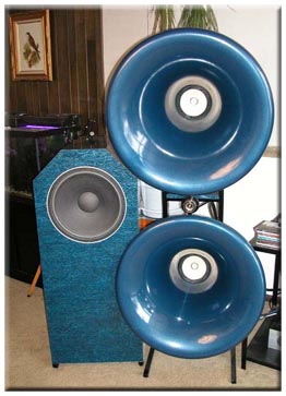 | Today, John builds speakers to order, specializing in high-efficiency horn and hybrid horn designs. And fun. "As far as KCS is concerned, it will stay small time and fun because when the fun is gone, how can one design fun loudspeakers? And isn't the hobby all about relaxing and having a bit of fun, not worrying whether your system is approved by other audio types? After all, you listen to it. It should be right for you and yours." Special order speakers take roughly 6 weeks depending mostly on the availability of the desired drivers. For John's favorite projects, the giant custom front horn systems, it's best to give John a call to discuss specifics. "And if you want a giant horn system... well, that's something I need to talk over with the future owner since there's so many options." |