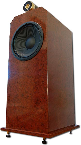 KCS AL-2 The AL-2s are a two-way hybrid horn design. The speaker employs two Alnico magnet-enabled drivers, the 12" Fostex W300AII woofer in a bottom-ported design and, sitting atop the cabinet, the Fostex T500a horn-loaded super tweeter. A first order crossover on the T500a uses a step-down transformer to adjust gain. The tweeter crossover point sits at 2,700Hz/-6dB. The woofer runs full range. "The design is a bottom-firing bass reflex alignment. Bottom firing ports or TLs sound better to me than front, back or side vents. Firing out the bottom allows you to eliminate the nasty Polyfill other designers use to keep port noise down while fooling the driver into sensing a larger cabinet. The T500a tweeter is Fostex's best and of the many top contenders for premium tweeter, my personal favorite. It's one amazing driver." "I prefer transformers to step down levels over fixed resistors or cheap potentiometers like all the others give you. As far as I know, no other loudspeaker design is available with adjustable step-down transformers. You know why? Cost. I also use only the best electrical parts. This speaker system uses Mundorf silver oil caps. These cost more than most drivers in other $4000 speaker. The cabinet is fully lined with rubber foam damping material. There's Deflex behind each driver and the front baffle is over 1.5" thick. The internal top panels are angled to reduce standing waves. Angled tops behave almost like a sphere. I find crimps to sound much better than solder so I use WBT crimps for all connections. The AL-2 is time-aligned and phase correct. This matters much in loudspeakers. I also believe binding posts are an evil thing and destroy the high quality sound a loudspeaker can deliver. Such a mass of metal breaks the electrical connection (most will even add solder) plus you have a wire going to posts that's different than the one that follows the posts. I know many people with $1000s in speaker wire but they run it to cheap posts with cheap internal hookup wire on other end. To me, this makes very little sense if performance is the goal." |