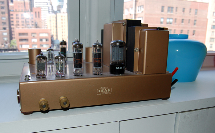 "I really ought to replace the rest of the wiring, plus the switch, power cord and the RCA sockets. Tons of oxidizing, corrosion and general decay in there. Plus put in a pair of motor run caps in the HV section. And deal with straightening out a buckled top plate which could reduce transformer hum (audible about a foot or two away, not through the speakers though). I've got all the components, just haven't bothered because it sounds so good already. I've never heard another amp that drives the Quads with such ease and authority." You will see a few of the other amps Patrick has hanging around the apartment including the Leak Stereo 20 (which undoubtedly enjoys the best view of any amplifier I've met), a Bedini 25/25 and a pair of Bottlehead Paramours which Patrick built. |