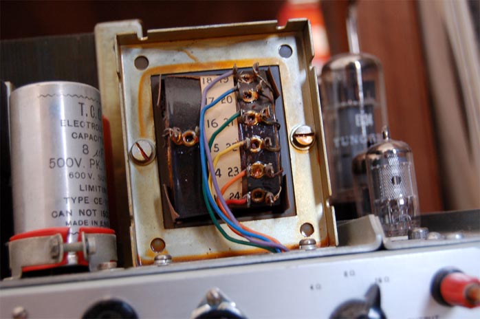 "The original caps were all electrolytic. It would have been nearly impossible to recap at such high capacitance and not stay with electrolytic due to size issues, so nearly all the new caps are humble Sprague Atoms. One pair are Russian PIO bought NOS from the Ukraine and one pair are Jensen coppers. I kept all resistors original as far as possible; where I had to replace them, I used Allen-Bradley carbon-comp or, where A-B values were unavailable, Riken Ohms. Quite a bit of rewiring was necessary too. |