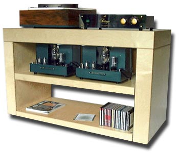 | LignoLab rack Standing in at 170 pounds, the LignoLab equipment rack from Germany is made from solid wood with a unique air/spring damping system that "isolates the entire system to 3Hz". According to the Tone Imports website, "the advantages are complete system isolation with all components tuned to the same frequency". If we did the video thing, you would see that if you shoved the LignoLabs rack, it'd accept that energy and slowly shrug it off kinda like a buoy floating in honey. Isolation, resonance, mass loading, draining, deadening ... if I were to summarize the general way with those pesky internal and external influences at casa Halpern, I'd say very little indeed. A delicate balance |