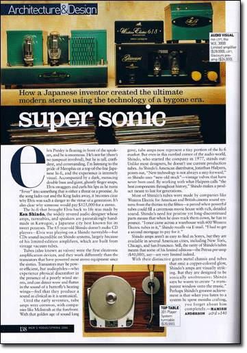 | it," Shindo recalled in an interview with Men's Vogue [Spring 2006, above]. "I had to get a second mortgage to pay for it." The WE 300B puts out 8 class A watts and retails for $28,000, making it one of the less expensive cost-no-object designs. Funny, isn't it? With amplifiers from the likes of Wavac, Kondo and Audio Note easily doubling in price over the Shindo -- some dipping into 6-digit cost territory, with Wavac making a $350,000 pair of mono blocks -- a $28,000 top of the line amplifier falls on the modestly priced side of the scale when viewed in the overall scheme of things. Funny, no - or slightly perverse? |