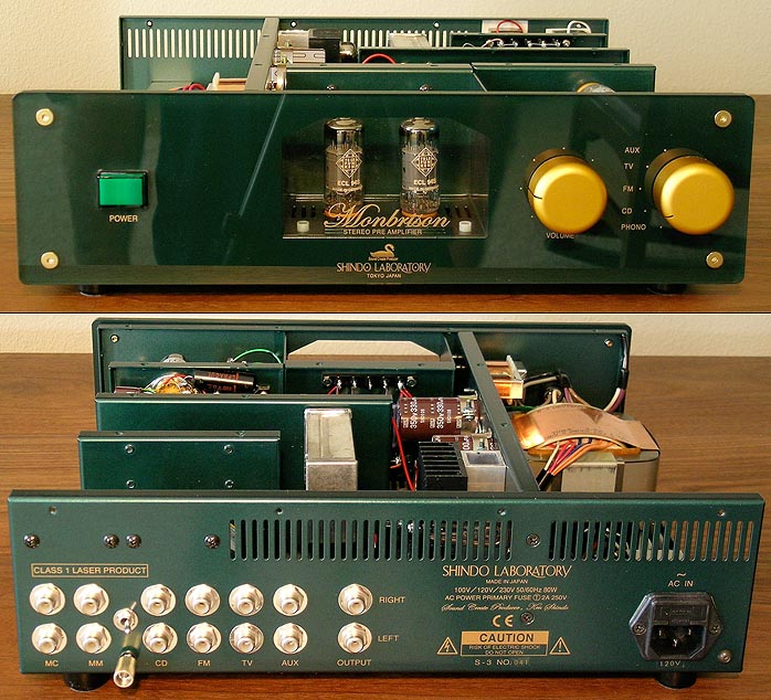| The Shindo Laboratory Monbrison is a beautifully hand-crafted and full-featured vacuum-tube preamplifier built by Ken Shindo and his family in Japan. Ken uses plenty of hand-picked NOS parts in the Monbrison and it's full of tubes - eight total: two Telefunken ECL 94S, two 12AU7, two 12AT7 and two 6X4WA. US importer Jonathan Halpern | ||||||||||