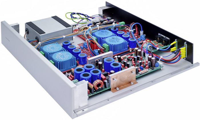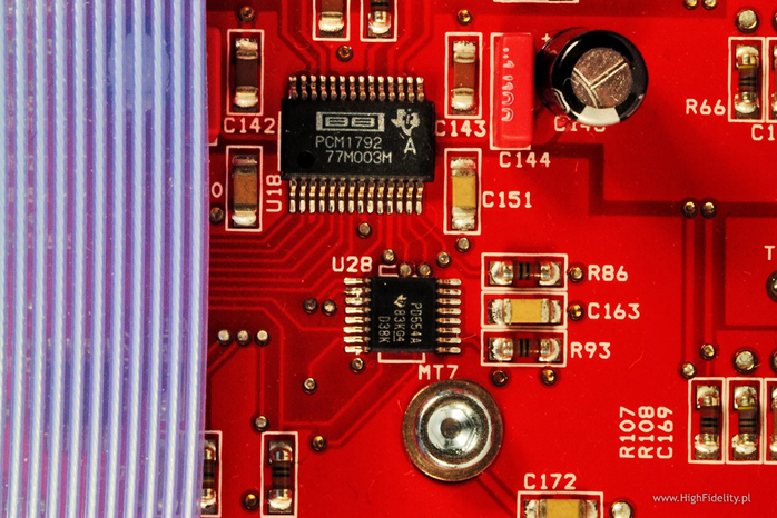 In the back are three-tier digital input and output sections and to the side sits the four-tier analogue section. These are very complex advanced circuits with multiple voltage regulators and high-quality passive parts like Dale resistors and Wima capacitors. The Burr-Brown PCM1792 chips always work at their maximum sample rate of 384kHz. These are DSD-compatible PCM chips. Since SACD converts to PCM (true 1-bit DSD converters no longer exist) Soulution opted to convert DSD to PCM straight off the disc. The converters are run in dual-mono mode and supported by an ultra-precise master clock generator. The current-to-voltage 80MHz converter operates in class A.