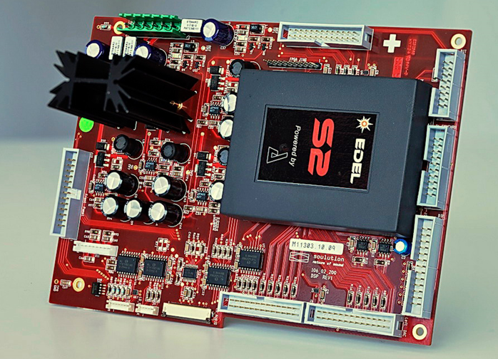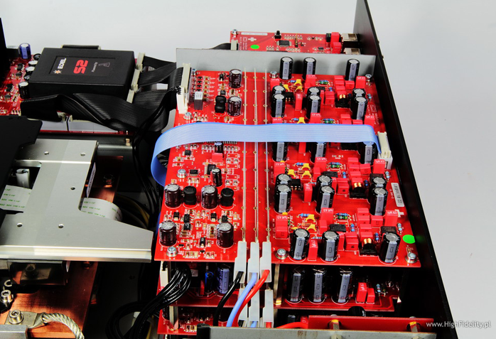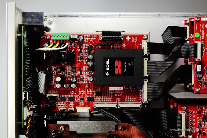 In either case the drive mechanism is bolted to an anodized copper plate that is decoupled by thick Sorbothane washers from the solid aluminum base. On the left atop a metal can containing the display circuitry sits the upsampling module. This S2 affair is sourced from Edel and contains Anagram Technologies Q5 and ATF upsampling algorithms. Soulution definitely has its own way when it comes to upsampling and oversampling. They use only synchro rates (8 x oversampling) and convert 44.1kHz signal to 352.8kHz and DSD to 384kHz PCM. This circuit also expands 16-bit word lengths to 24 bits which is based on true extrapolation rather than just adding 8 empty bits. That’s why in the 745 the section in the D/A converter handling the same function has been defeated.