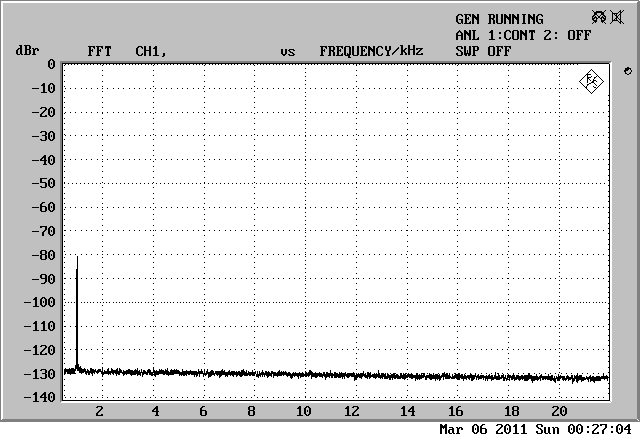 Spectrum of a 1kHz sine wave at -80dBFs with the power supply and buffer board |