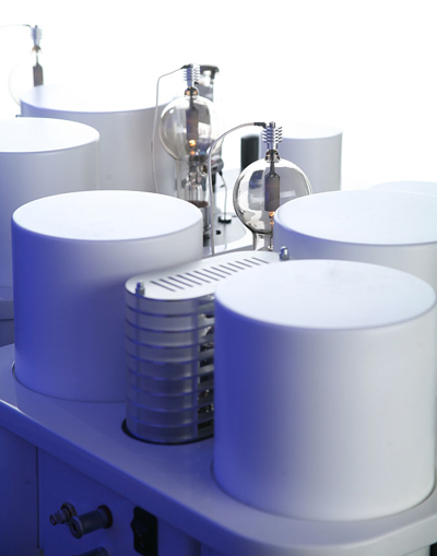 The lateral heat sinks couple to the heater stabilizers for all tubes on deck. The tube covers combine aluminum and acrylic and the letters on front of each chassis were CNC-machined, then sand-blasted and finally bonded to the enclosure.