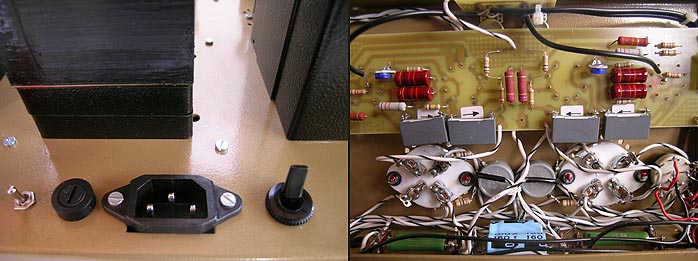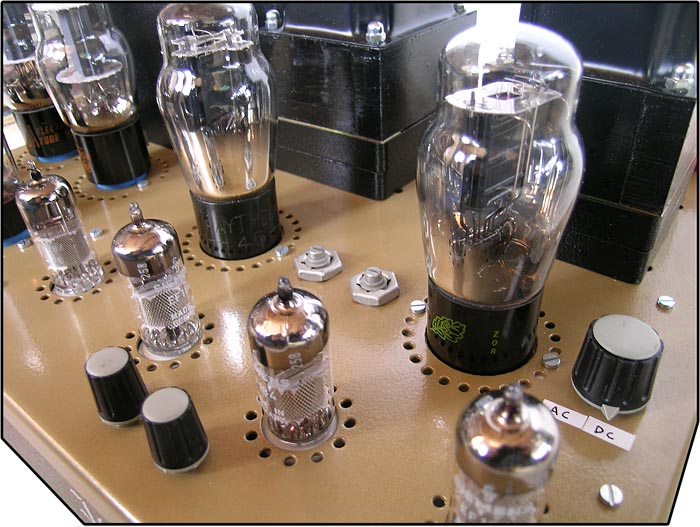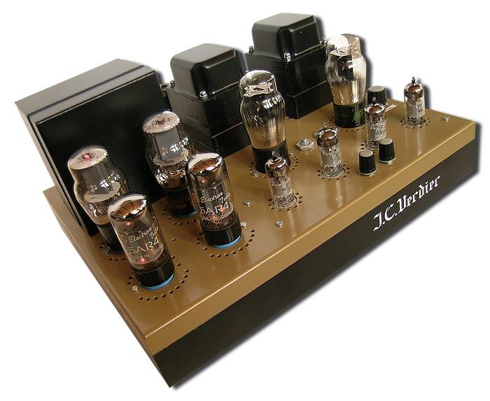 Where the Yamamoto A-08S oozes sheer class in its cosmetic styling, the J.C. Verdier is less concerned with plainly visible screw heads or plastic knobs. This Triode Spirit amp is a more old-fashioned "hammer-finish" affair altogether. Incidentally, the AC/DC-heater adjustment can only be changed during power-off. |