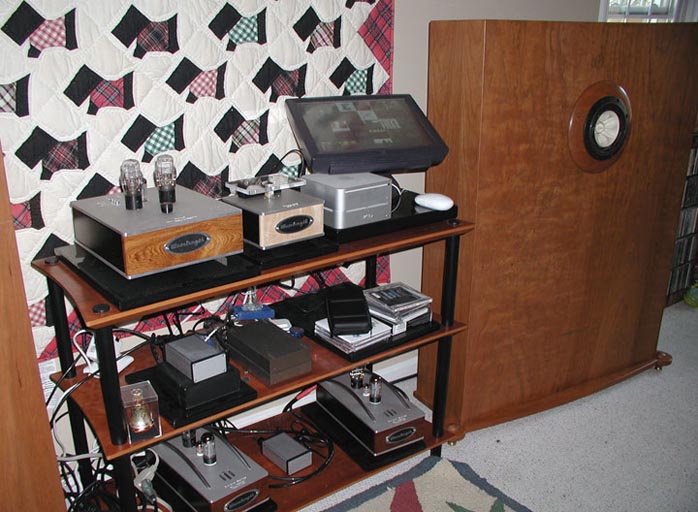 His system "Well, here's a picture of my system du jour. As with many designers like myself, there are very few pieces that stick in a system long. So let's start with the constants. Cables are all Nirvana Audio, SL, SX, power, you name it. Speakers are the prototypes of the Wall of Sound that I designed for Terry Cain (yes, I paid for these). I think of Terry every time I play this system. Black Diamond Racing shelves under everything. Currently, I'm also using a Mac Mini Server with ELO Touch Screen, LaCie 500GB base, two backup 500GB Firewire drives. Cosecant with the Numerator 24/96 DAC module, over 100 high rez and over 500 red book CDs. Royal Directly Heated Triode Line Preamplifier and the Corona VT52 (5-watt) Directly Heated Triode SET amplifiers with custom MagneQuest Cobalt Core output transformers." Excellent! Let's move on to the topic of the day. Tell us a bit about the Cosecant USB DAC. "The Cosecant is where it all started at CES 2004. At first I did not think this technology would work. Was I wrong! Today, the Cosecant v3 connects the USB controller to a DAC module. The USB firmware to run that DAC module resides there so each module has its own developed code. The output of the module connector is sent directly to the 6GM8/ECC86 dual triode output tube, which drives the transformer-coupled output. The Cosecant has an external power supply with IEC connector to isolate the power from the DAC and its audio transformers. The Cosecant is also available with an optional volume control if you want to control your entire system from the computer output. "Those are the very basics. Before we go on though, it's important to clarify that the v2 you bought in early 2007did not have an upgrade path. Since I really wanted the line to be forward thinking, I went ahead and totally redesigned the USB engine. This is my own design and I wrote the software (1,800 lines of code for the USB controller to do what it does) like no one else does on the planet. This was a huge undertaking and explains why a number of other companies want to buy or steal it. It is like a small computer... heck it's more powerful than some hand-held computers. "Now you like any other v2 user who upgrades, will have entirely new electronics. The version 2 did not have modular DACs nor did it have the capabilities of any firmware upgrades. Your version 2 and the newer version 3 have the Transcendental 16-bit DAC electronics. The version 3 has a modular DAC design with upgrades to the circuitry from the version 2. If you like, you now can user upgrade to the Numerator Module and have 24-bit support. So that's it in a nutshell. But some people don't get it. I can't believe the amount of questions and the people who just want to buy the module and put it in their CD players. Like that's going to work." |