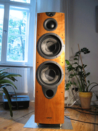 Outfit ... The four driver chassis are fitted to a respect-inducing 30cm wide and 120cm tall baffle compared to which my Thiel CS 2.4 (formerly defamed as "coffin" by my girlfriend) seems quite narrow chested. Just as imposing is fit 'n' finish. The cherry veneer of real wood with piano lacquer gloss on our loaners scored high. The MDF enclosure, fashioned in-house as are the drivers, uses a mix of resin-bonded Aussie pine and Eucalyptus (no protests on behalf of homeless koalas, please). Wharfedale claims that the labor-intensive enclosure and lacquer finish consume two full weeks in production. |