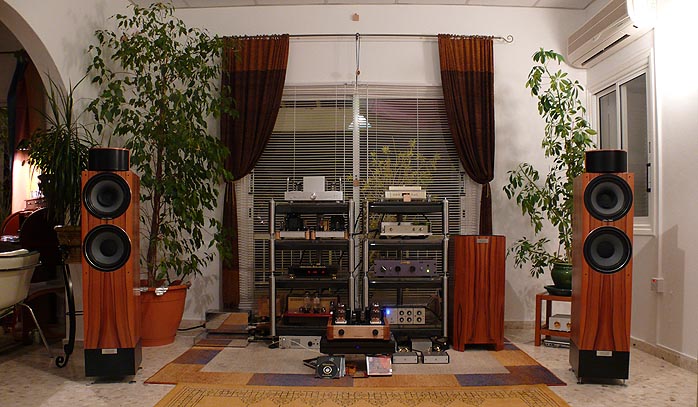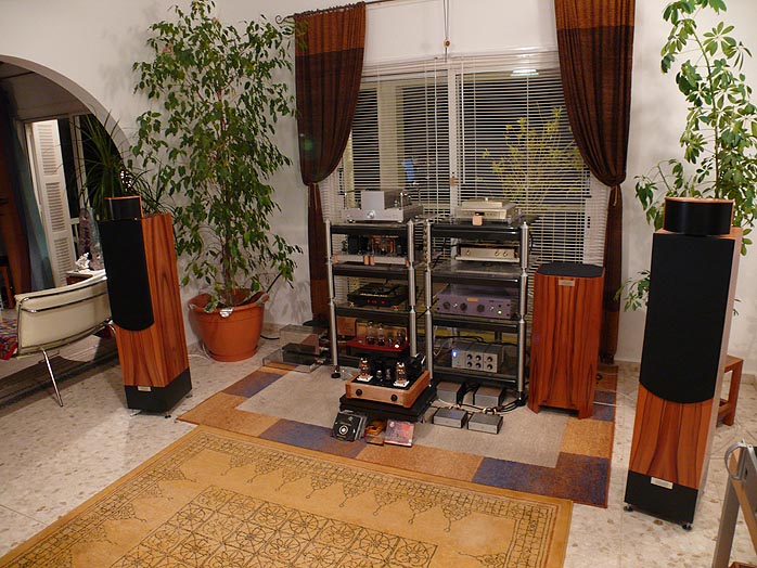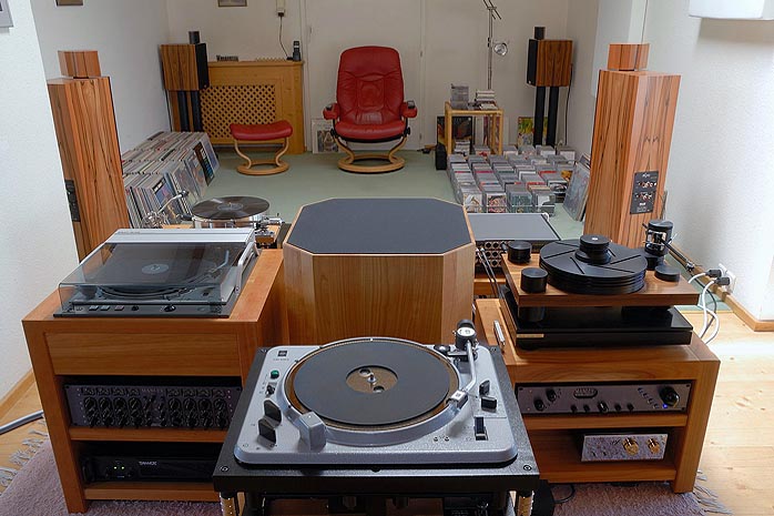The brain System Control's six knobs are best thought of as volume pots for the upper three and Quad-style tilt tone controls for the lower three. The exact network slopes and compensation curves remain undisclosed but are hinted as being progressively linked 2nd and 4th-order types. Hannes Frick calls Martin Schützenauer a linker Bursche in that regard - wired backwards. It points at unconventional solutions not covered in the text books. They become fully germane only to other gifted engineers who think outside the box and tie their shoe laces from top to bottom. WLM's excellent instructions provide for quasi default settings to get you started. Still, the emphasis is firmly on "twirl, learn and trust your ears". It's a commandment as alien to most career audiophiles as thinking for themselves is to army grunts who are still shell-shocked from boot camp. [Martin has even authored the MultiChannel Preamp above which, passively, creates 4.0 surround to play back superior Pentatone and related software where the rears are encoded purely for ambience. On that particular count, Frick feels his beloved analog finally comes up short against digital by simply not providing this level of information. His domestic setup below.] |
