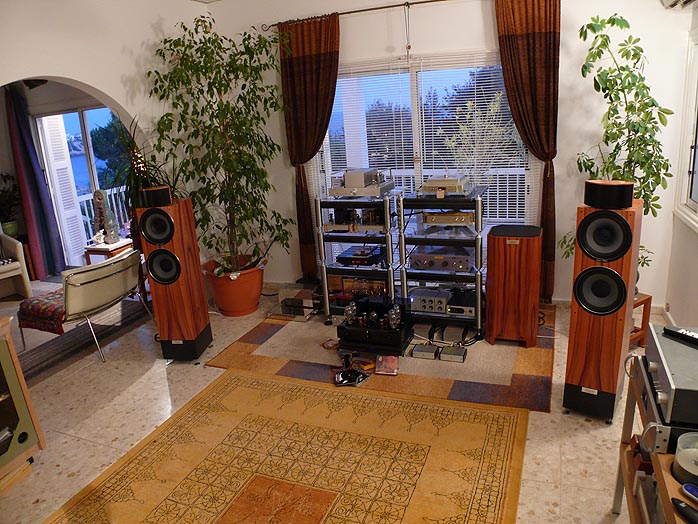 Due to the recommended formula of speaker to speaker distance relative to the listener (1.5 : 1), I increased the former by two feet over my standard setup, running into limitations of course due to my fixed short-wall orientation but maximizing the staging strengths inherent in this design as much as I realistically could accommodate. |