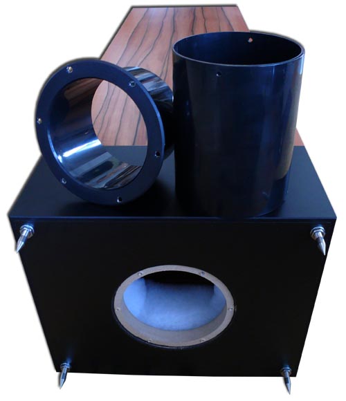 Once installed, the Grand Viola cuts a Living Voice-style profile with its blacked-out plinth that cleverly hides the large-diameter downfiring port. That port is a twin-sleeved affair, with a short master sleeve screwed into the plywood recess and a longer one of slightly larger diameter slipped onto it. By undoing six wood screws, one can remove the longer port sleeve and remount the short one to experiment with bass loading. The speaker enclosure with the long port is tuned to 25Hz but port conversion can alter the bass alignment. In general, the longer pipe as delivered creates leaner, drier and 'faster' bass. The shorter pipe increases output and weight to an extent that could be counter indicative for the majority of rooms. It's not a fully predictive affair and experimentation is necessary to determine the optimum arrangement. |
