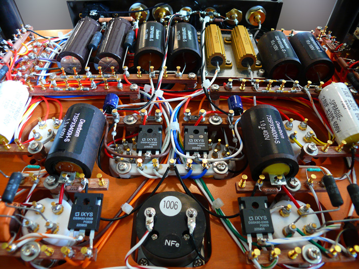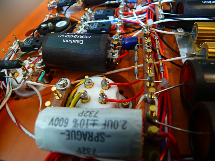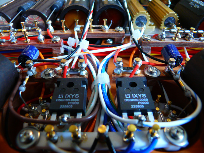 Here we see more Ebony-encased capacitors, two white 2uF Sprague caps for two of the rectifier tubes and beefy heat-sinked Dale resistors plus Ixys power schottky rectifiers.