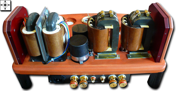 Removing the top aluminum cover reveals the four transformers and two bakelite-encased filter caps for the output tubes. "We enclose our smaller caps in Ebony casings but these particular capacitors were too large. Our very hard epoxy resin potting stops film capacitors from vibrating. This has tremendous audible benefits."