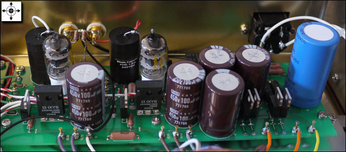 Shigeki-San didn't consider the sonics optimized when using simple CR coupling. The final circuit uses resistive loading at the D/A converter output which then is coupled directly to the tube inputs in a single feedback-less step. Great care was taken to shield the simple amplification circuit from power supply interactions which now required additional plate and screen grid circuits. Deeming the latter absolutely critical to sonics, Yamamoto chose a constant current Mosfet solution. The heater circuit is rectified with a large Schottky diode. Another overriding concern was parts reduction to retain circuit simplicity and the sonic purity Shigeki-San associates with it. Of the dual-differential outputs of the BB PCM 1794A chips, only a single output per channel is used since it sounded better to him than a paralleled connection.