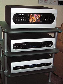 #2: Bel Canto Design spotlighted their universal disc player dubbed simply The PLayer [$8,900], and a significantly price-reduced version, the PLayer PL-1A which arrives without the DCDi Faroudja video enhancement circuitry and rings in at $5,490. Their new PRe2 stereo preamplifier [$2,690] is based on the PRe6 and available with an optional internal phono section [$800]. These components do not herald a new style but are the latest additions in as clean a line as I've ever seen. #3: Over the course of 2004, Classé will introduce their new Delta range of electronics. This line is visually stunning, with pressure-shaped curved aluminum panels forming the front and sides of each unit and a large fluorescent display panel on each unit except on the power amps. I'm not allowed to show you any images at this time so you'll have to wait for the official rollout. But take my word for it - it'll be well worth the wait. The range will include a CD player, two universal players, a stereo preamp, two preamp-processors and several power amplifiers. The Delta components will present a significant challenge to Mark Levinson and Krell. |