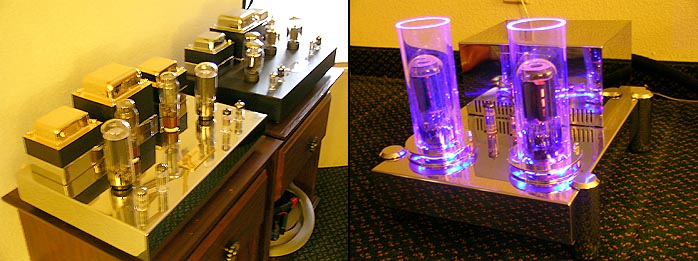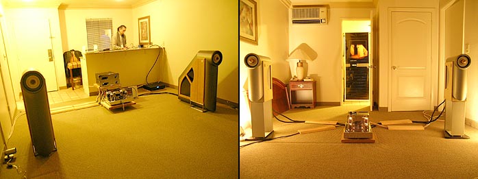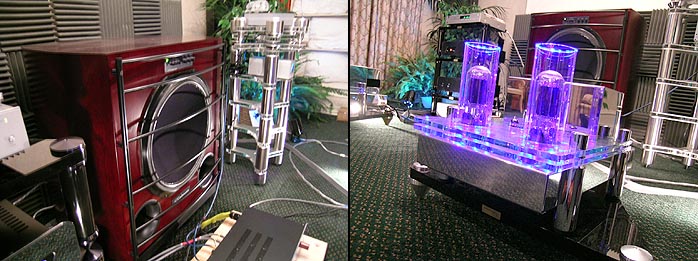 Art Audio's Joe Fratus gets an unofficial award for most-sighted tube amp designer. Many last-minute requests for amp loans one week prior to the CES had Fratus commit to bailing out a number of otherwise ampless rooms. The best-sounding ones (and among my favorites) were the two with Rethm. A PX-25 with Gill Audio DAC and preamp drove the Third Rethms with one JMlab subwoofer in Joe's own room wired nearly exclusively with Prana Wire (Joe owns the Thirds in his studio). Seamless blending, heightened immediacy, startling dynamics and a complete absence of the infamous "Lowther shout" were hallmarks of this exhibit [below left, with the right image the Ars Aures/Art Audio room fronted by Art Audio's new push/pull 845s].