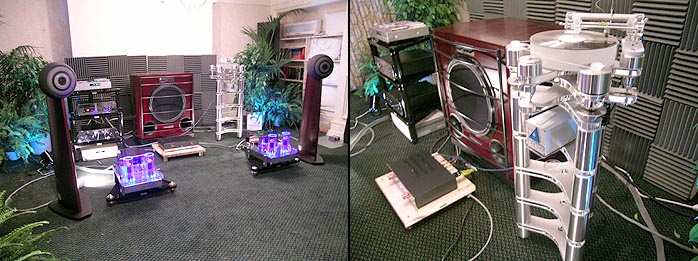 In full-on dress code, three of the firm's amplifiers now offer the blue lighting and column footer option. This includes the Carissa Signature 845 SET, the new 845 p/p Quartet monos (50 watts) and the Adagio high-power 100-watt SET monos (300B version forthcoming). The light-show Art Audio amps were on duty in Christophe Cabasse's room which also housed the Mother Of All Subwoofers and The Grand Daddy Of All Turntables.