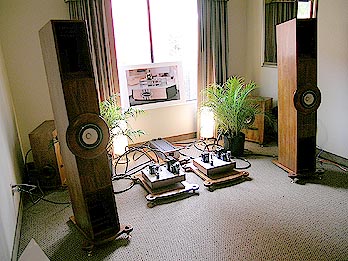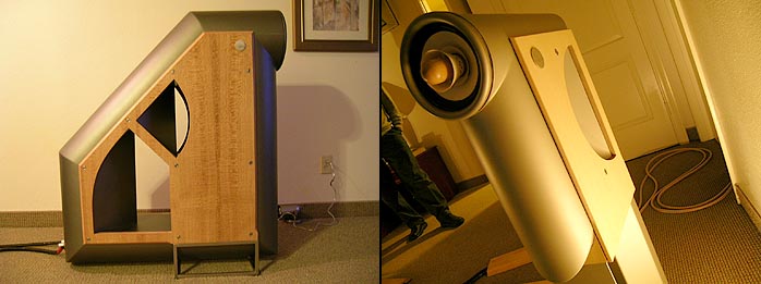 Most innovate nomenclature of the shows goes to Terry Cain's new Cain & Cain IM-BEN. It had Alan Kafton of PowerWing and Cable Cooker fame do a double take. "IM-BEN?" He was obviously confused. I interjected. "You're Alan, I am Ben." Now he got it. "No, you are Alan. I want." Actually, IM stands for "Imaging Matters" but I-am-Ben is how one properly refers to this now smaller than man-sized double horn around a single Fostex full-range driver. Price is $6,500/pr for the upscale acid-bleached Cherry finish. Terry ran his new model with Wavelength Audio electronics and stereo Bailey subwoofers to augment bass below 50Hz.