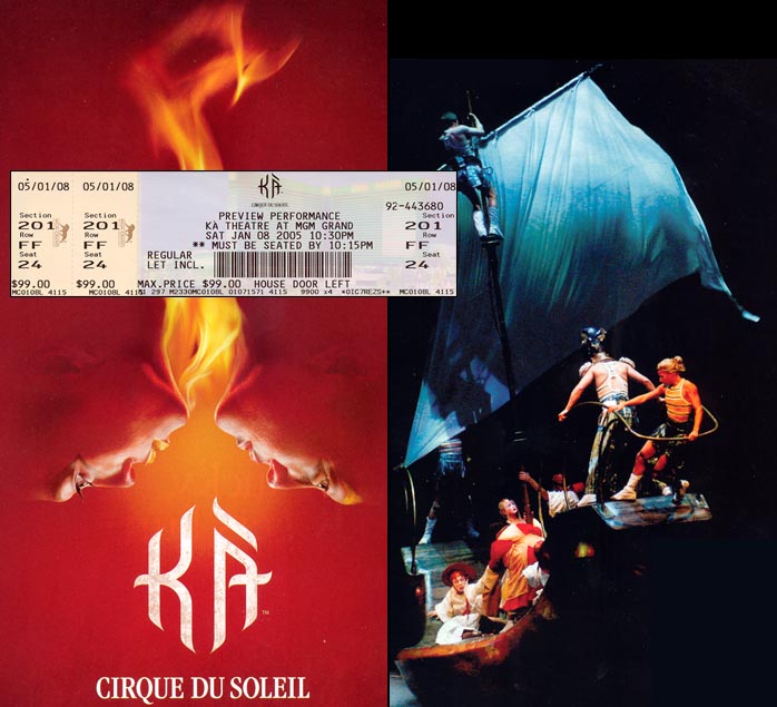 The most exciting evening for your reporter saw him and his better and prettier half inside the MGM Grand's new Cirque de Soleil show "Ka". It opened in November and was thus still offered as a preview of sorts. Questionnaires asked for audience feedback after the 90-minute show but as far as we were concerned, this was a fully mature event. We had thrilled to the Bellagio's "O" spectacle with the 10,000 gallon pool last year and promised ourselves to take in at least one Cirque this year. Ka is a complete knock-out, with a full linear story line set on a hydraulic stage inside a purpose-designed auditorium. The performance platform moves from horizontal to fully vertical and anywhere in-between.